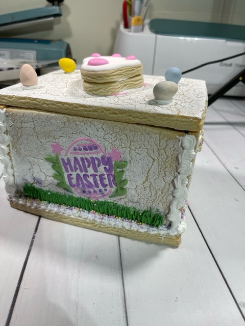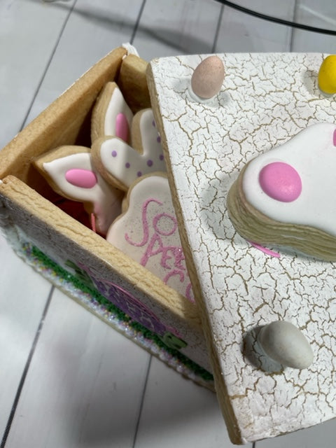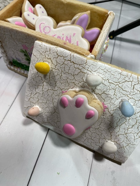 This fun box design was created by Stencil Expressions in collaboration with B's Cookie Basket and debuted during The Colorful Cookie's Spring Cookie-A-Thon in April 2022. If you have an all access pass to the Cookie-A-Thon you can watch the video over and over until 4/2023. You could also use these same stencils and masks to create an adorable Easter gingerbread house.