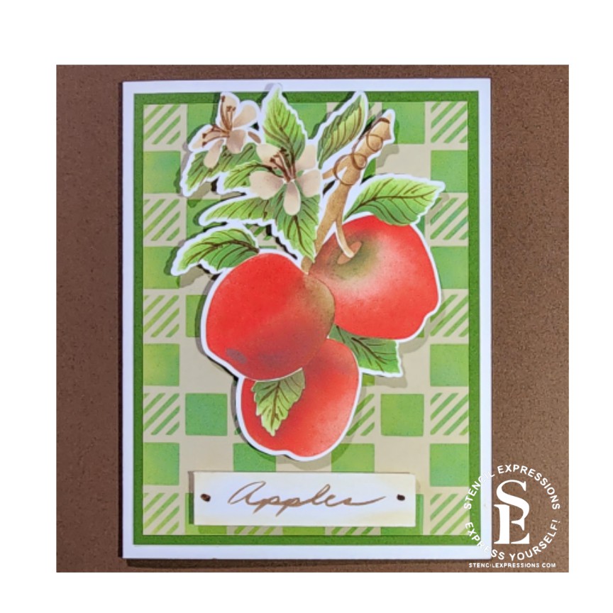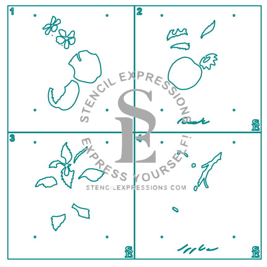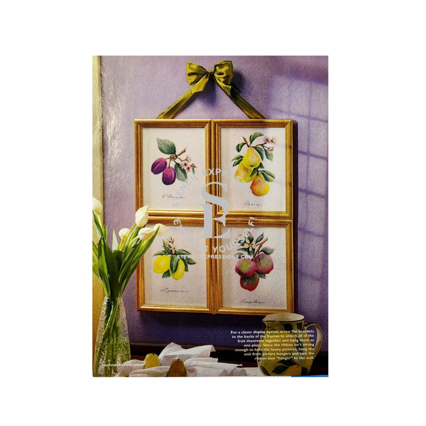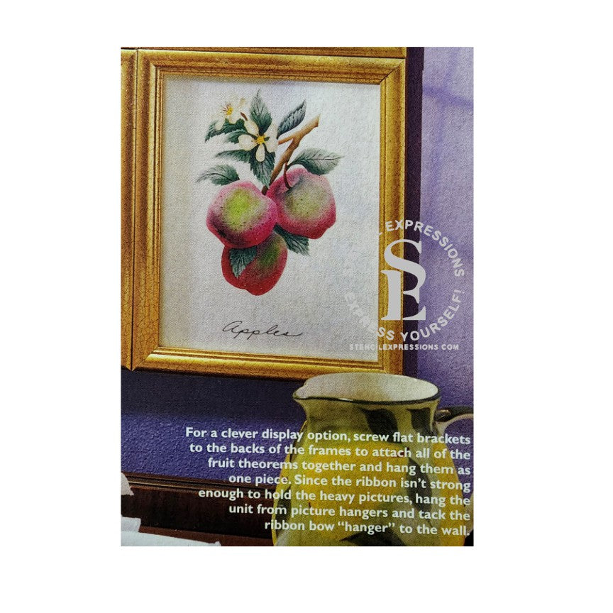 This Apple Theorem stencil is one of Suzie's older designs from her Art 2 Go Stencil Collection. It was featured as one of four theorem stencil designs in a special publication called Crafts & Decorating Showcase, May 2000 edition (see photo of all four fruit theorems, below).