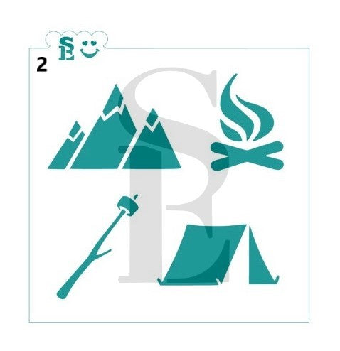 Stencil #2: Mountains 2.75" x 1.75", Campfire 2" x 1.5", Marshmallow/Stick 2.2" x 1.7", Tent 2.5" x 1.25"