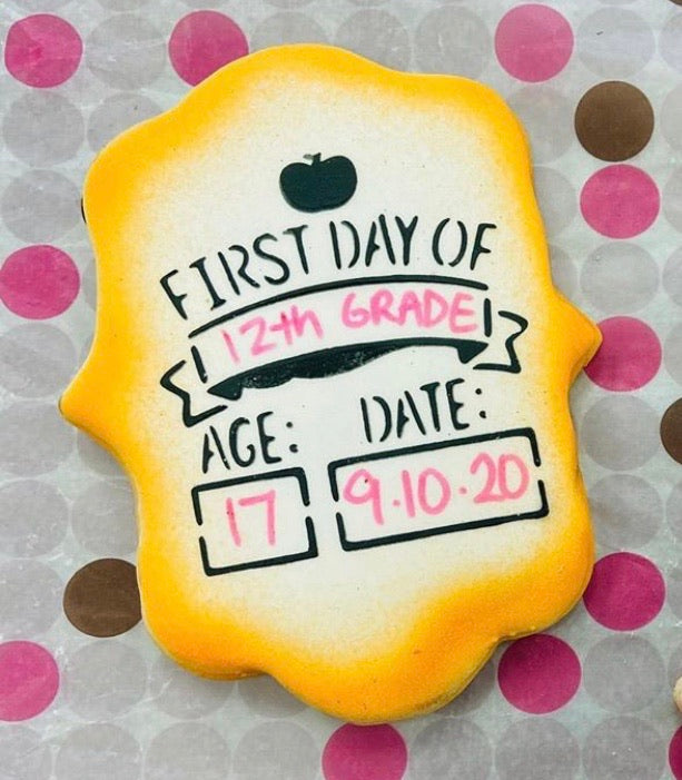 What a SWEET picture this would be... Your child holding a custom cookie as they prepare to board the bus each new school year!! Your customers will love this one and it will be fast and easy for you to create this look with this design and one of our background stencils.
